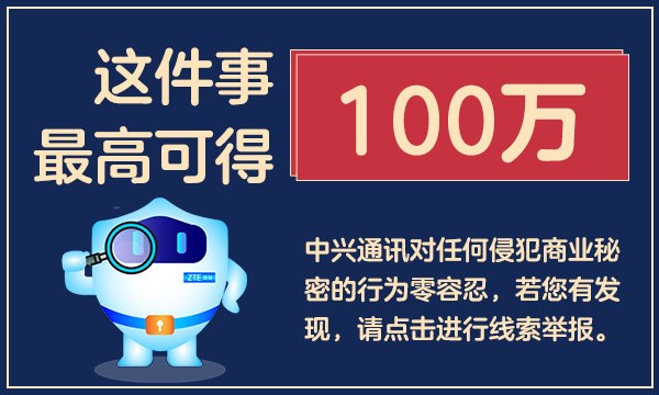 中兴通讯对任何侵犯公司商业秘密的行为零容忍,若您有发现,请通过下方任一方式进行线索举报,奖励最高100万。