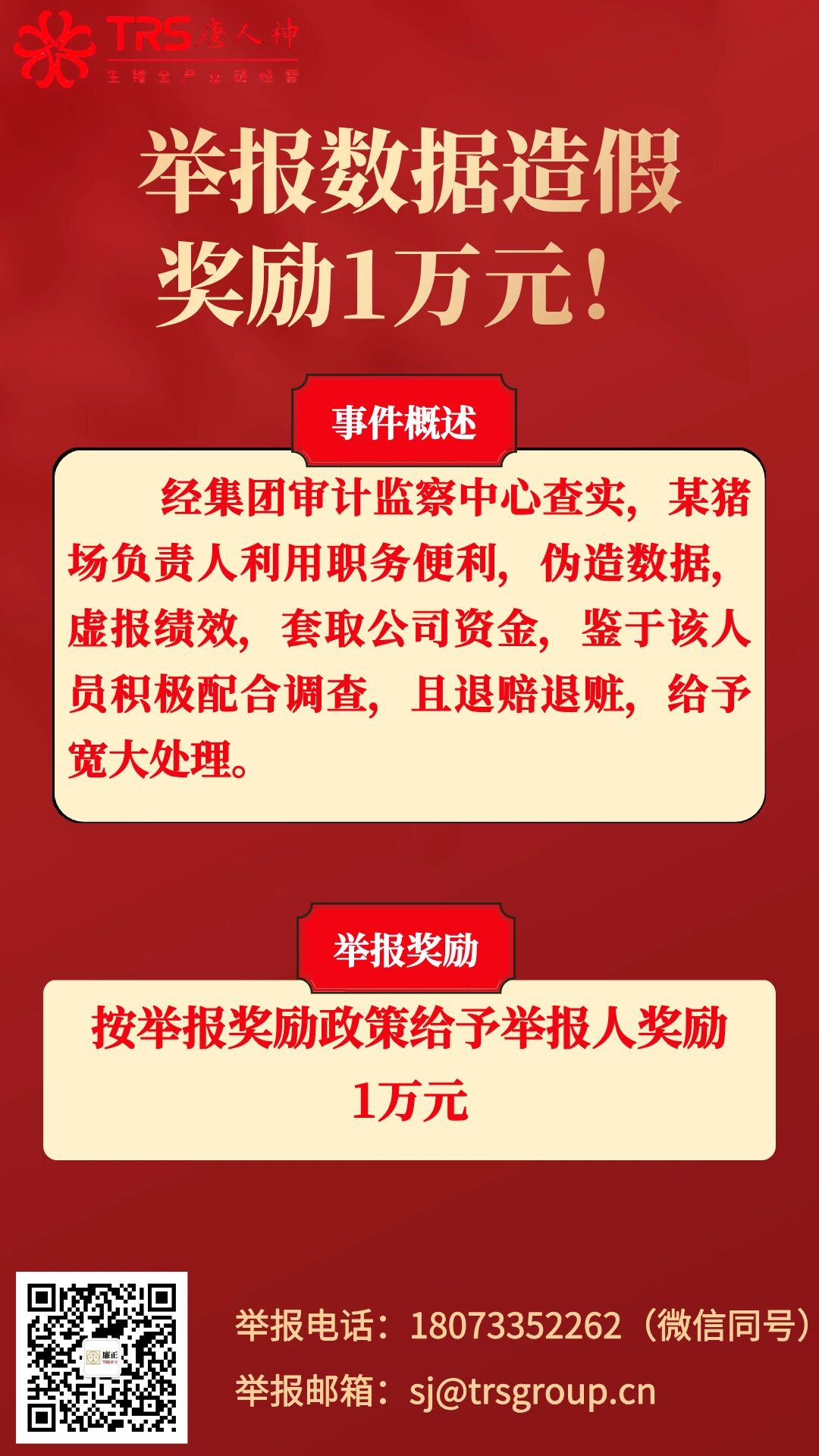 经集团审计监察中心查实,某猪场负责人利用职务便利,伪造数据虚报绩效,套取公司资金,鉴于该人员积极配合调查,且退赔退赃,给予宽大处理。