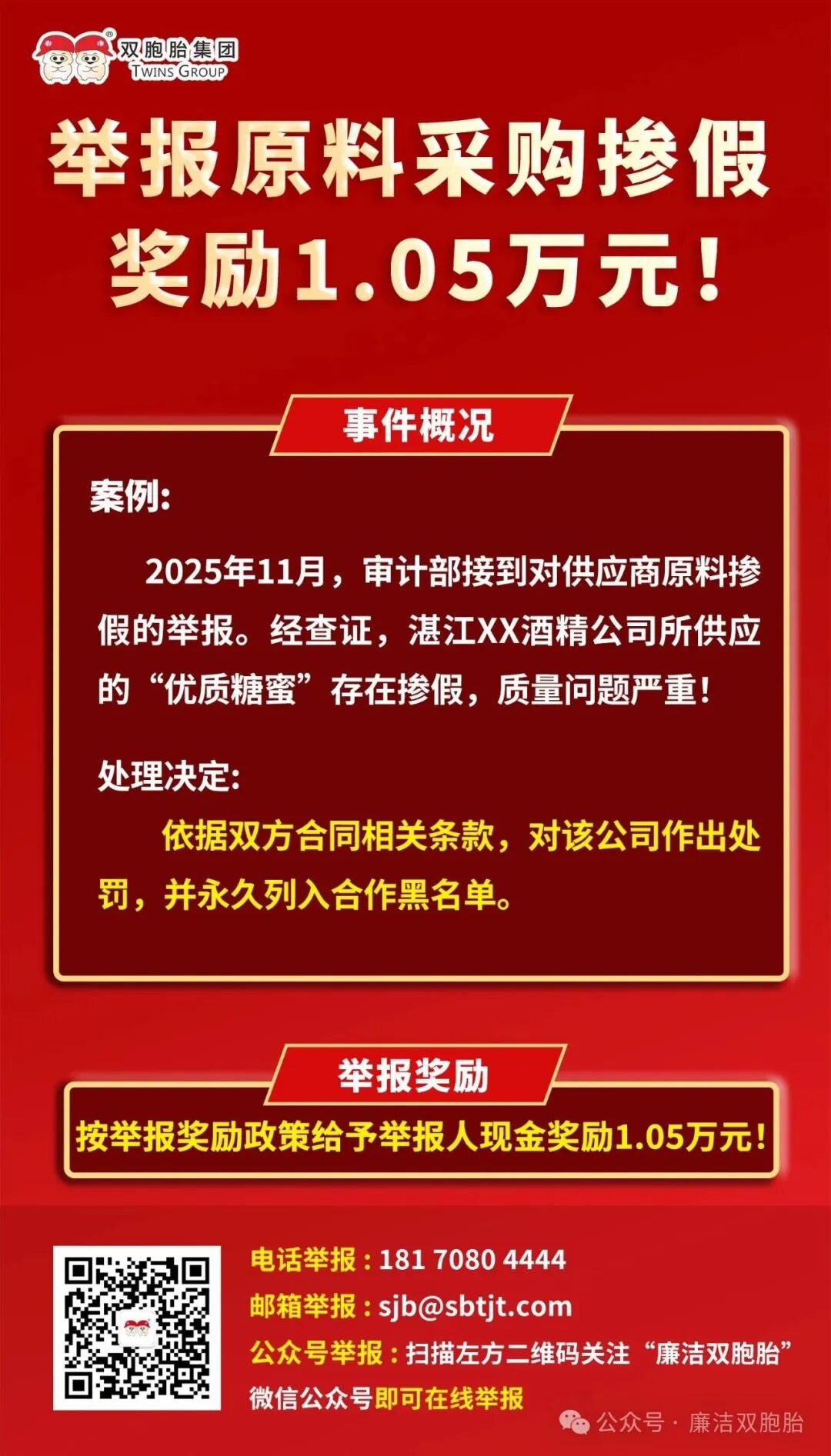 双胞胎集团举报奖励系列丨举报原料采购掺假 奖励1.05万元!