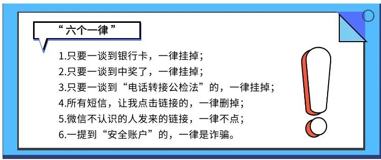 最后,请各位时刻谨记“六个一律,八个凡是”,守护钱包,时刻防范电信网络诈骗!