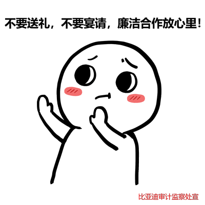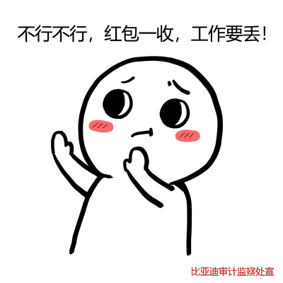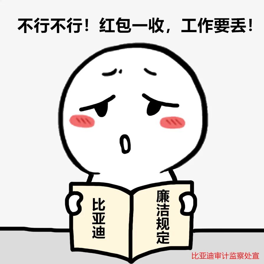 在日常工作中, 有些同事收到合作伙伴微信红包或吃请时, 往往想拒绝又怕驳了对方面子、让人下不来台。 那么这时候该咋办呢? 当当当当~~ 一波比亚迪官方拒绝表情包来袭! 01 02 03 04 05 赶紧保存下来吧! 如果合作伙伴向你发起红包或请客攻势, 第一时间向TA发送对应的官方拒绝表情包, 就对啦! 来源: ,版权归原作者所有,如涉侵权,请联系我们删除,谢谢! 分享到 : 63.2K