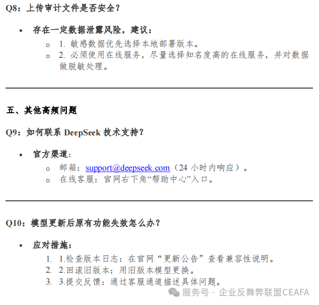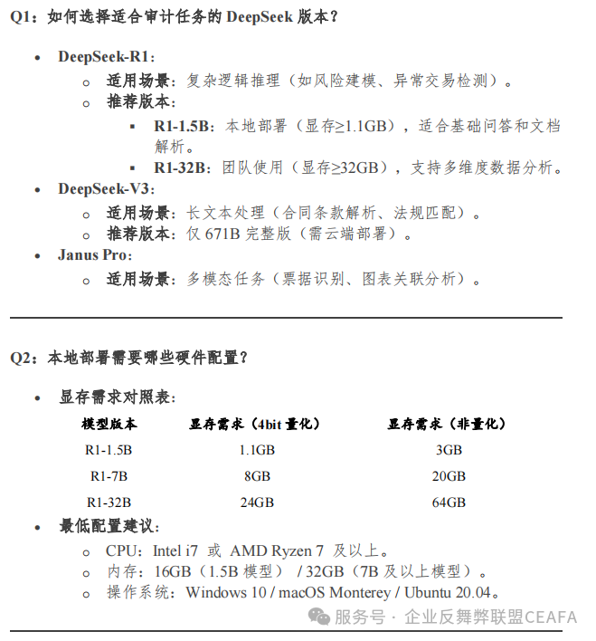 这里需要注意:无论是模型蒸馏还是量化,都会或多或少降低模型的能力。 三、DeepSeek审计能力 (一)数据采集与预处理 DeepSeek支持多种数据源的接入,包括财务系统、ERP系统和数据库等,确保数据获取的全面性。 通过数据清洗、缺失值填补、异常值检测和格式转换等操作,DeepSeek能够自动清洗、转换和整合数据,确保数据质量,并将不同来源的数据统一格式化,为后续分析提供高质量的数据基础。 (二)数据分析与挖掘 DeepSeek提供多种数据分析工具,如趋势分析、比率分析和异常检测等,帮助审计人员快速识别潜在的风险区域。DeepSeek还可以进行时序分析,揭示财务数据中的潜在问题。 DeepSeek利用机器学习算法识别潜在风险和异常交易,通过结合历史数据训练风险识别模型,实时监控异常交易、非正常模式和潜在的舞弊行为。 (三)支持自定义分析模型 用户可以根据具体审计需求自定义分析模型,针对特定场景(如税务审计、资产管理审计等)设定独特的分析参数。 (四)风险识别与评估 DeepSeek基于预设规则和机器学习模型识别潜在风险领域,通过预设的审计规则和数据驱动的机器学习模型,自动识别潜在风险区域,帮助审计人员发现财务漏洞、操作风险或法律风险。 DeepSeek会对识别出的风险进行评估和排序,根据风险的严重程度、发生概率和影响范围,自动评估并排序,帮助审计人员优先处理最关键的风险点。 (五)审计证据收集与管理 通过DeepSeek的自动化分析,系统能够生成详细的审计底稿,包括审计过程、分析方法、数据来源及审计结果等内容,确保审计工作的透明性和可追溯性。 DeepSeek支持审计证据的电子化存储和管理,审计证据以电子形式存储,支持文档管理、版本控制和权限管理,方便审计人员快速查阅和追溯。 (六)可视化与报告生成 DeepSeek提供丰富的可视化图表,包括图表、热力图和流程图等,帮助审计人员直观展示分析结果,提升报告的可读性和说服力。 系统能够自动生成标准化的审计报告,包含详细的数据分析结果、风险评估和审计结论等内容,显著减少报告编写时间。