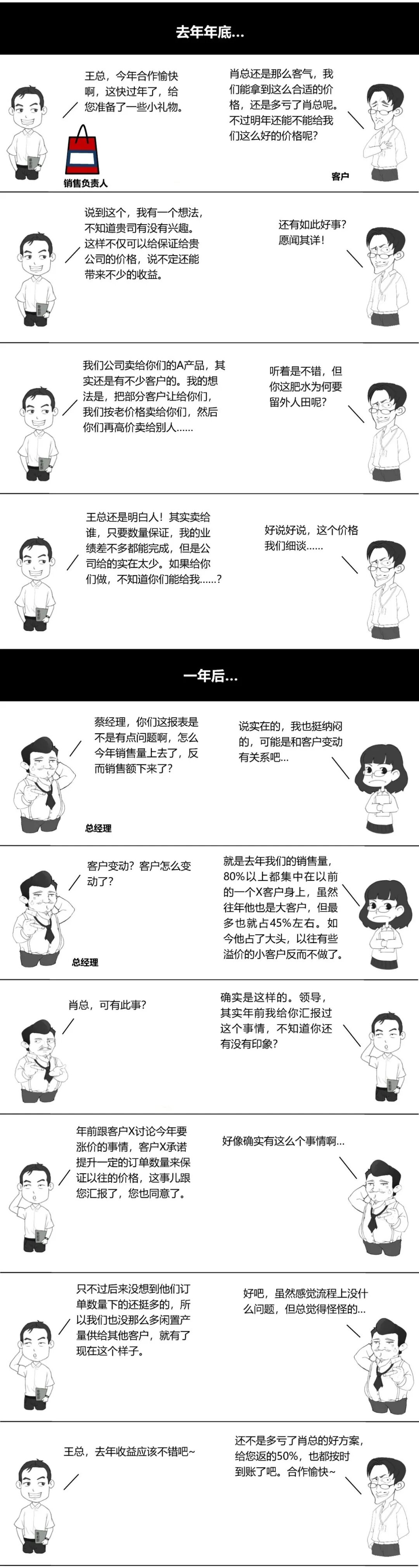 订单量大部分交给“关系客户”,由他再卖给小客户,销售人员“吃里爬外”,看着销量上去了,然而利润受损了。