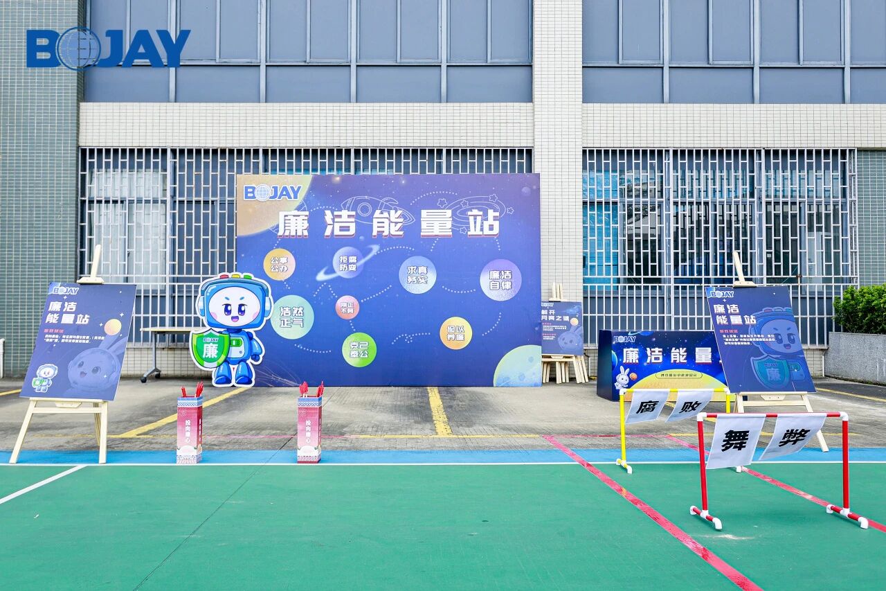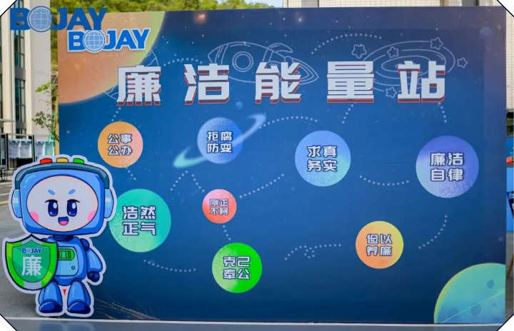 赛道上设置了“腐败”和“舞弊”的模拟障碍,参与者需灵活跨越才能抵达终点。跨过障碍,才能走上正道,简单的游戏也道破了廉洁从业无捷径,坚守底线是坦途的深意。 活动精彩瞬间 通过趣味十足的游园活动,让大家在欢声笑语中潜移默化领会了廉洁的重要性,自然而然地将廉洁准则融入到日常工作中。 此外,廉洁小游戏还准备了丰富的小奖品,让员工们在收获廉洁新认知的同时,也切实感受到公司的暖心关怀与正向鼓励。 廉洁IP征名 为廉代言,一“名”惊人 形象介绍 廉洁IP形象整体为科技感机器人造型,核心设计包含三大廉洁符号。 其一,手持绿色 “廉洁盾牌”,直观传递守护寓意。 其二,胸前 “廉洁指数仪表盘”,指针满格指向绿色区域,代表诚信度100%。 其三,头盔顶部设“红、黄、绿三色警示灯”,分别对应 “廉洁警诫”、“风险提示”、“合规达标” 状态,赋予了形象动态文化表达功能。 廉洁IP征名 本次廉洁活动月特别发起了廉洁IP征名活动,以大家的鲜活创意为廉洁文化注入新活力。 大家脑洞迸发、巧思云集,纷纷为可爱的廉洁IP形象投递专属命名:廉BoBo、廉小杰、博洁君等一个个充满创意的名字,既贴合博杰特色,又传递廉洁理念。 经过线上投票和线下评审团综合评选,最终“廉BoBo”脱颖而出。廉为姓,寓意廉洁,BoBo为博杰英文Bojay的前两位。廉BoBo既与博杰形成谐音呼应,又自带萌感,成为集体认可度最高的选择。 未来,这个凝聚着集体智慧的IP形象,将成为博杰廉洁文化传播的重要使者,持续为博杰的廉洁生态注入新力量。
