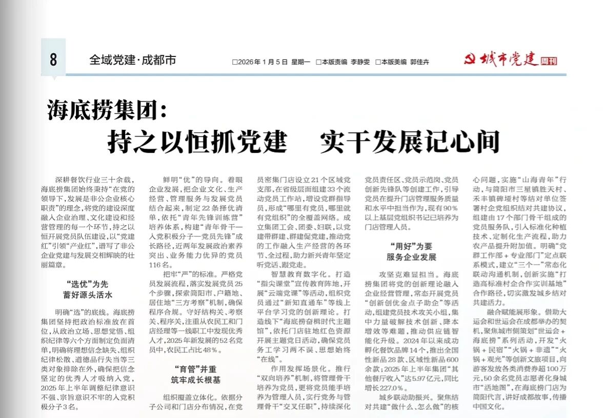 1月5日,《人民日报》旗下《城市党建》周刊2026年第1期专题报道《海底捞集团:持之以恒抓党建 实干发展记心间》。 全文如下: 深耕餐饮行业三十余载,海底捞集团始终秉持“在党的领导下,发展是非公企业核心职责”的理念,将党的建设深度融入企业治理、文化建设和经营管理的每一个环节,持之以恒开展党员队伍建设,以“党建红”引领“产业红”,谱写了非公企业党建与发展交相辉映的壮丽篇章。 “选优”为先 蓄好源头活水 明确“选”的底线。海底捞集团坚持把政治标准放在首位,从政治立场、思想觉悟、组织纪律等六个方面制定负面清单,明确将理想信念缺失、组织纪律松散、道德品行失当等三类对象排除在外,确保把信念坚定的优秀人才吸纳入党,2025年上半年调整纪律意识不强、宗旨意识不牢的入党积极分子3名。 鲜明“优”的导向。着眼企业发展,把企业文化、生产经营、管理服务与发展党员结合起来,制定22条择优清单,依托“青年先锋训练营”培养体系,构建“青年骨干-入党积极分子-党员先锋”成长路径,近两年发展政治素养突出、业务能力优异的党员116名。 把牢“严”的标准。严格党员发展流程,落实发展党员25个步骤,探索简阳市、户籍地、居住地“三方考察”机制,确保程序合规。守好结构关、考察关、程序关,注重从农民工和门店经理等一线职工中发现优秀人才,2025年新发展的52名党员中,农民工占比48%。 “育管”并重 筑牢成长根基