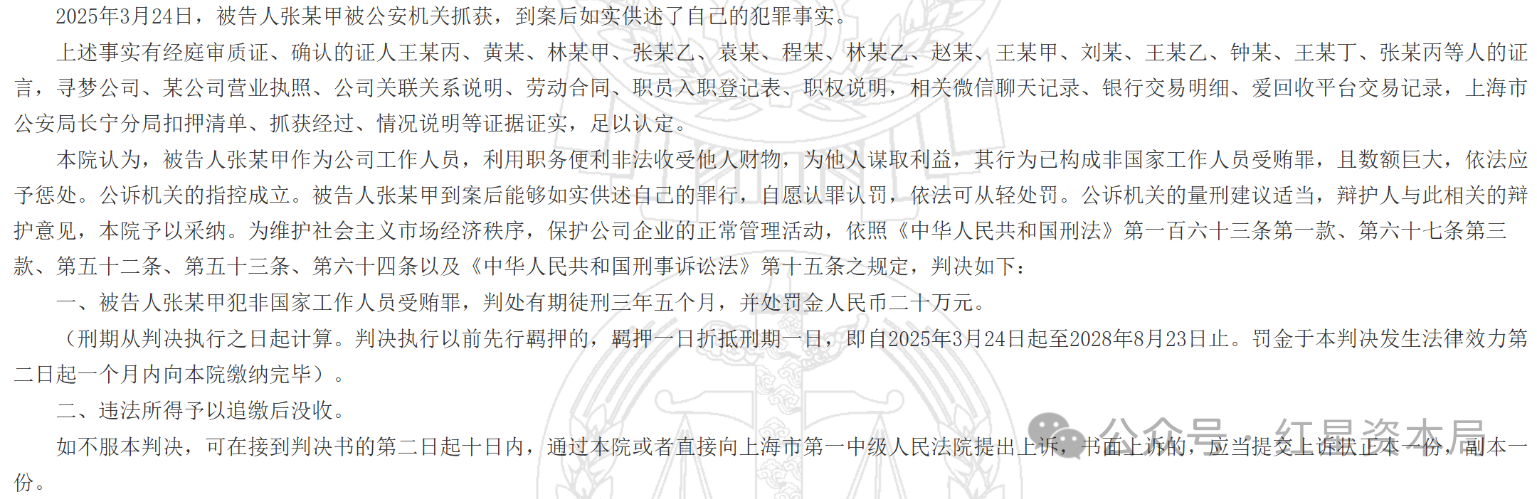 为维护社会主义市场经济秩序,保护公司企业的正常管理活动,依照《中华人民共和国刑法》第一百六十三条第一款、第六十七条第三款、第五十二条、第五十三条、第六十四条以及《中华人民共和国刑事诉讼法》第十五条之规定,判决被告人张某甲犯非国家工作人员受贿罪,判处有期徒刑三年五个月,并处罚金人民币二十万元。