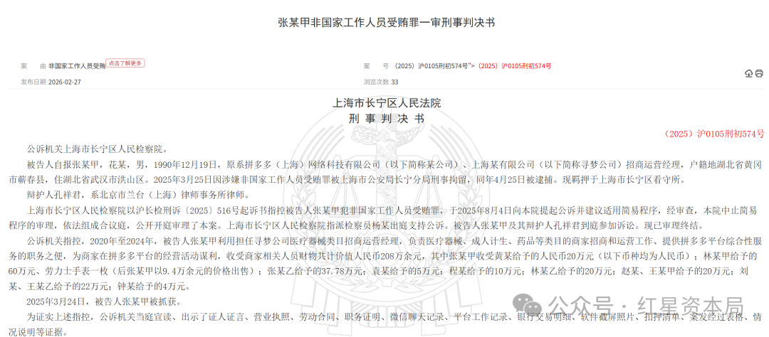 近日,上海市长宁区人民法院判决书披露,拼多多一名负责医疗器械类目的招商运营经理受贿208万元财物,一审获刑3年5个月。