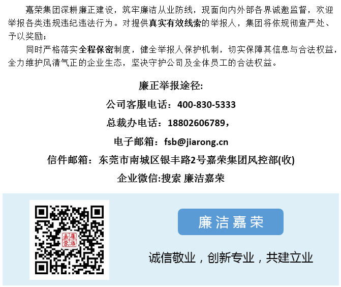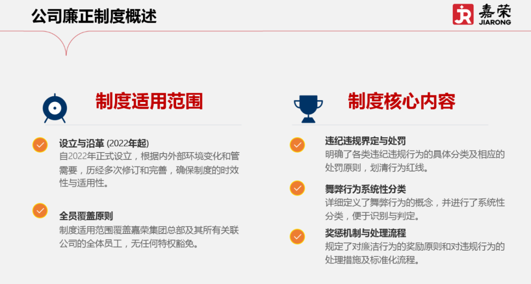 1、制度焕新|全维度规范 扎紧廉洁“制度笼子” 集团正式发布 2026 年公告版《廉正及违纪行为管理制度》,在原有基础上完成全面优化升级: ①覆盖范围更广:延伸至全体员工所有违纪行为; ②行为界定更清:细化四大类舞弊行为; ③奖惩规则更明:明确轻重处罚情形及举报奖励机制; ④执行要求更严:培训考核与晋升调薪直接挂钩; ⑤流程保障更全:明确调查权限、赋予员工申诉权利。 2、线下精培|总部经理级先行 筑牢管理示范防线 本次培训率先聚焦总部各部门经理开展线下专题培训。课程紧扣新版制度核心,结合管理岗位高频风险环节,精准讲解制度条款、红线界定与防控方法;切实强化自身/团队中的责任担当,以管理层率先垂范推动廉洁理念层层传导。 3、云端普学|全员线上打卡 实现廉洁教育无死角 除总部经理级外的全集团人员,采用嘉荣训练营线上打卡形式开展培训,覆盖集团本部/子公司全体员工,培训周期贯穿全年。在指定时间完成线上课程学习,独立完成、严禁代学代打卡,确保学习时长达标、打卡信息准确,让廉洁知识精准触达每一个岗位。 4、以考促学|全员严格考核 结果挂钩职业发展 所有完成线下/线上培训人员,均需参加线上廉正知识统一考核,试题紧扣制度核心与岗位实操,考核规则详见公司OA公告。同时,培训参训情况、考核结果将纳入员工个人成长积分及绩效考核,以考核压实学习成效,让廉洁合规理念深植于心、笃见于行。 5、重要提示 全体员工需在2026年3月31日前通过企微完成《诚信承诺书》线上签署存档,及线上培训打卡/考核,各单位/部门做好核查督促,确保全员覆盖;新版制度全文及配套附件已上传OA,敬请查阅学习。 廉筑根基,合规致远。嘉荣集团将以此次制度发布与全员培训为契机,持续深耕廉洁合规文化建设,让诚信成为每一位嘉人的职业底色,以风清气正的职场环境,护航企业发展!