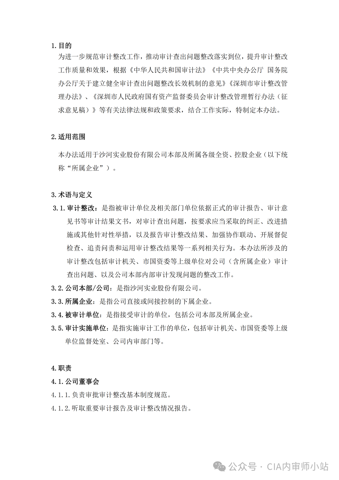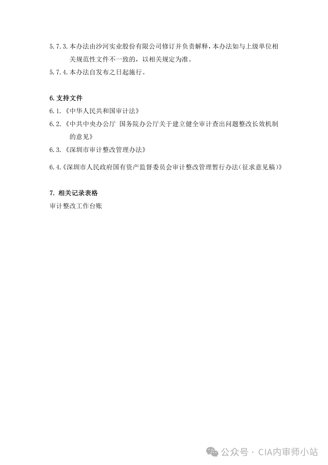 5.7.1 国家证券监管机构对上市公司审计整改有特殊规定的,上市公司优先适用证券监管规定。5.7.2 所属企业内部审计发现问题整改工作,可参考本办法相关规定执行。5.7.3 本办法由沙河实业股份有限公司修订并负责解释,本办法如与上级单位相关规范性文件不一致的,以相关规定为准。