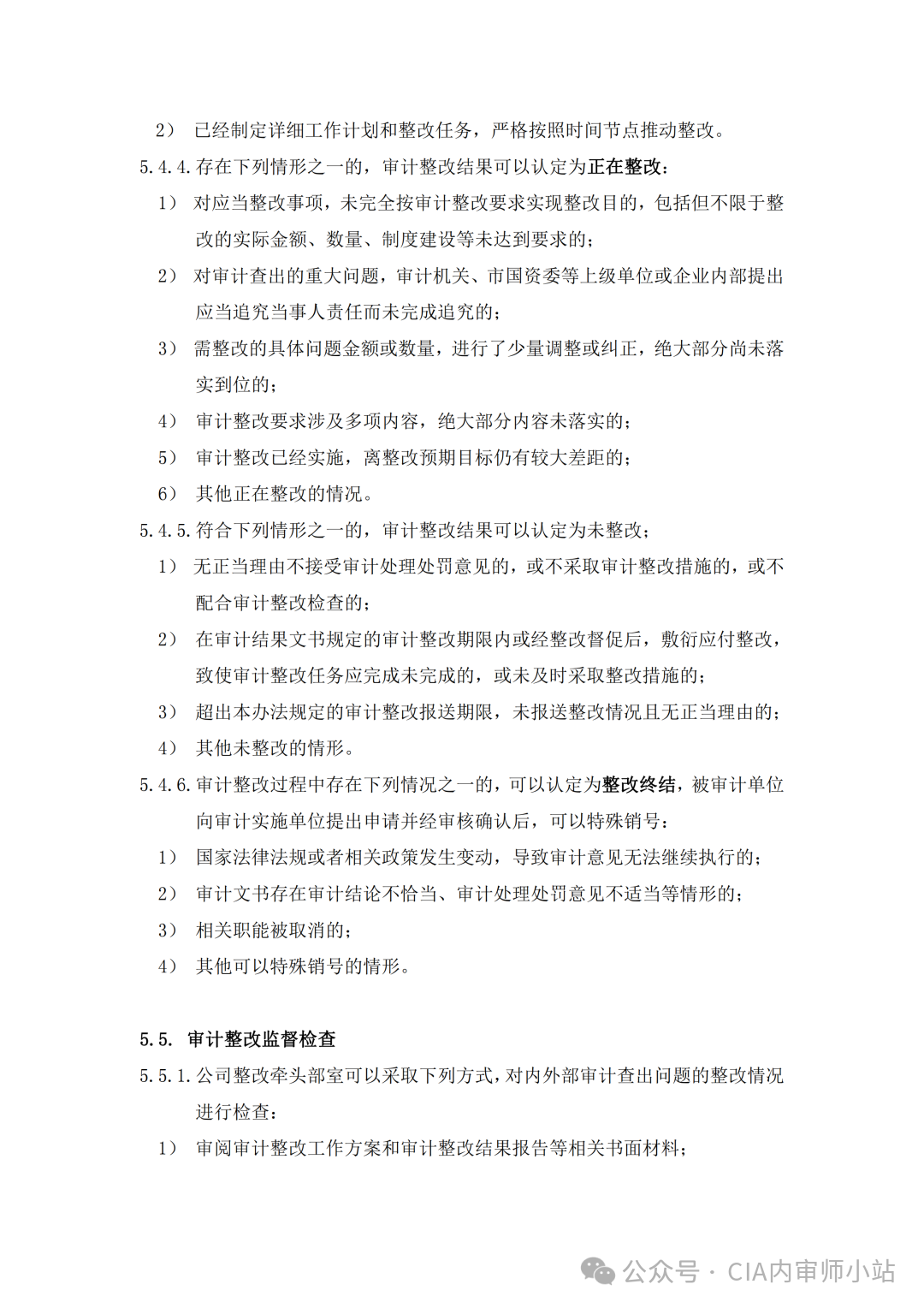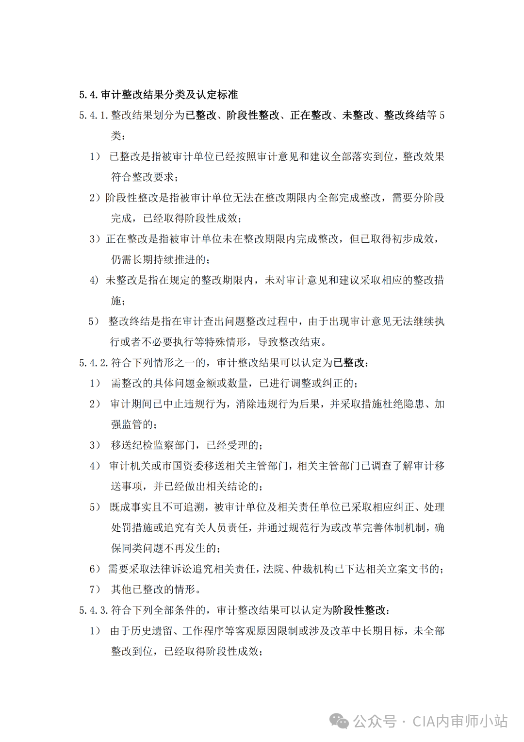 5.4.1 整改结果划分为已整改、阶段性整改、正在整改、未整改、整改终结等 5 类:1)已整改是指被审计单位已经按照审计意见和建议全部落实到位,整改效果符合整改要求;2)阶段性整改是指被审计单位无法在整改期限内全部完成整改,需要分阶段完成,已经取得阶段性成效;3)正在整改是指被审计单位未在整改期限内完成整改,但已取得初步成效,仍需长期持续推进的;4)未整改是指在规定的整改期限内,未对审计意见和建议采取相应的整改措施;5)整改终结是指在审计查出问题整改过程中,由于出现审计意见无法继续执行或者不必要执行等特殊情形,导致整改结束。5.4.2 符合下列情形之一的,审计整改结果可以认定为已整改:1)需整改的具体问题金额或数量,已进行调整或纠正的;2)审计期间已中止违规行为,消除违规行为后果,并采取措施杜绝隐患、加强监管的;4)审计机关或市国资委移送相关主管部门,相关主管部门已调查了解审计移送事项,并已经做出相关结论的;5)既成事实且不可追溯,被审计单位及相关责任单位已采取相应纠正、处理处罚措施或追究有关人员责任,并通过规范行为或改革完善体制机制,确保同类问题不再发生的;6)需要采取法律诉讼追究相关责任,法院、仲裁机构已下达相关立案文书的;5.4.3 符合下列全部条件的,审计整改结果可以认定为阶段性整改:1)由于历史遗留、工作程序等客观原因限制或涉及改革中长期目标,未全部整改到位,已经取得阶段性成效;2)已经制定详细工作计划和整改任务,严格按照时间节点推动整改。5.4.4 存在下列情形之一的,审计整改结果可以认定为正在整改:1)对应当整改事项,未完全按审计整改要求实现整改目的,包括但不限于整改的实际金额、数量、制度建设等未达到要求的;2)对审计查出的重大问题,审计机关、市国资委等上级单位或企业内部提出应当追究当事人责任而未完成追究的;3)需整改的具体问题金额或数量,进行了少量调整或纠正,绝大部分尚未落实到位的;4)审计整改要求涉及多项内容,绝大部分内容未落实的;5)审计整改已经实施,离整改预期目标仍有较大差距的;5.4.5 符合下列情形之一的,审计整改结果可以认定为未整改:1)无正当理由不接受审计处理处罚意见的,或不采取审计整改措施的,或不配合审计整改检查的;2)在审计结果文书规定的审计整改期限内或经整改督促后,敷衍应付整改,致使审计整改任务应完成未完成的,或未及时采取整改措施的;3)超出本办法规定的审计整改报送期限,未报送整改情况且无正当理由的;5.4.6 审计整改过程中存在下列情况之一的,可以认定为整改终结,被审计单位向审计实施单位提出申请并经审核确认后,可以特殊销号:1)国家法律法规或者相关政策发生变动,导致审计意见无法继续执行的;2)审计文书存在审计结论不恰当、审计处理处罚意见不适当等情形的;