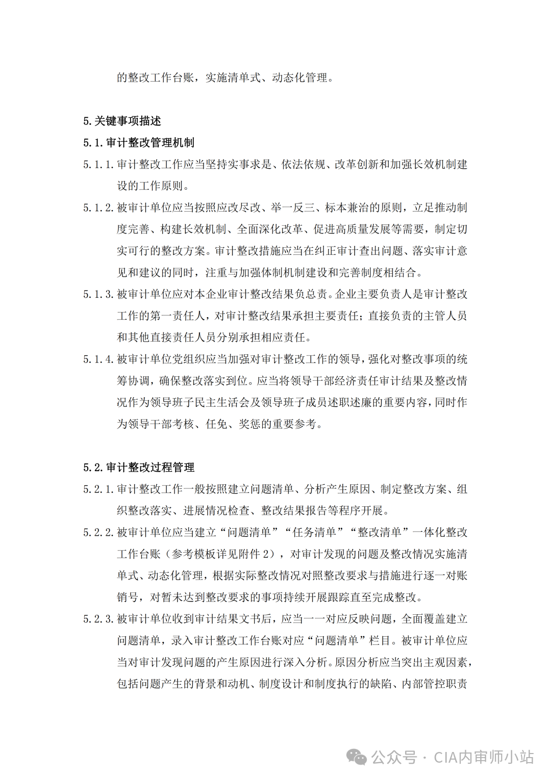 5.1.1 审计整改工作应当坚持实事求是、依法依规、改革创新和加强长效机制建设的工作原则。5.1.2 被审计单位应当按照应改尽改、举一反三、标本兼治的原则,立足推动制度完善、构建长效机制、全面深化改革、促进高质量发展等需要,制定切实可行的整改方案。审计整改措施应当在纠正审计查出问题、落实审计意见和建议的同时,注重与加强体制机制建设和完善制度相结合。5.1.3 被审计单位应对本企业审计整改结果负总责。企业主要负责人是审计整改工作的第一责任人,对审计整改结果承担主要责任;直接负责的主管人员和其他直接责任人员分别承担相应责任。5.1.4 被审计单位党组织应当加强对审计整改工作的领导,强化对整改事项的统筹协调,确保整改落实到位。应当将领导干部经济责任审计结果及整改情况作为领导班子民主生活会及领导班子成员述职述廉的重要内容,同时作为领导干部考核、任免、奖惩的重要参考。