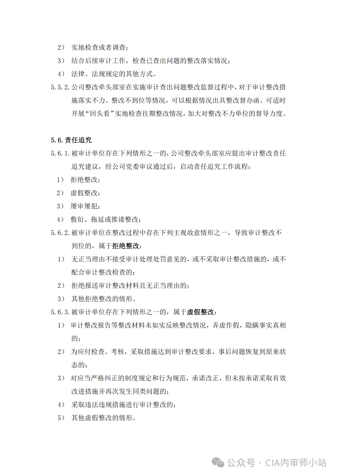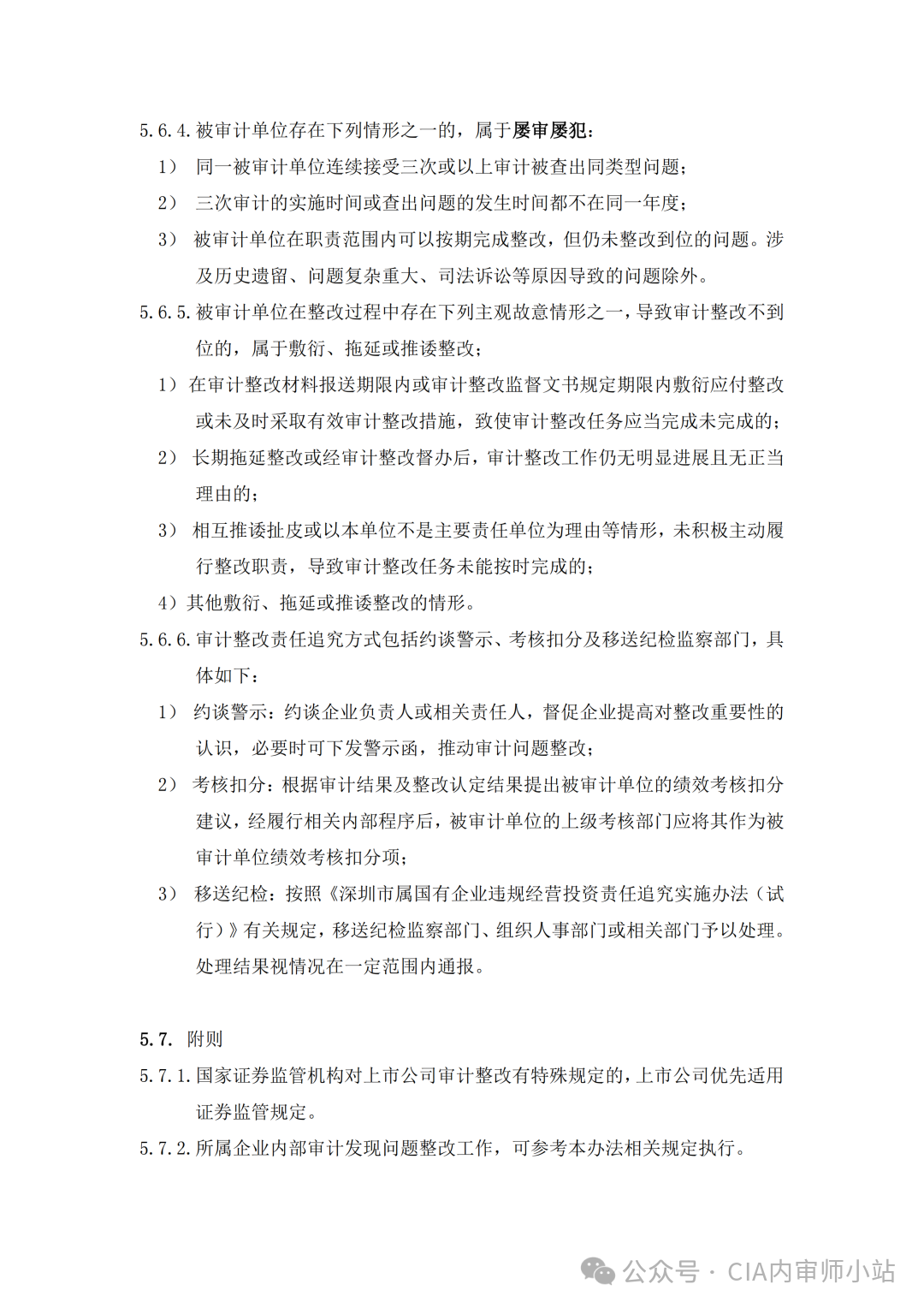 5.6.1 被审计单位存在下列情形之一的,公司整改牵头部室应提出审计整改责任追究建议,经公司党委审议通过后,启动责任追究工作流程:5.6.2 被审计单位在整改过程中存在下列主观故意情形之一,导致审计整改不到位的,属于拒绝整改:1)无正当理由不接受审计处理处罚意见的,或不采取审计整改措施的,或不配合审计整改检查的;5.6.3 被审计单位存在下列情形之一的,属于虚假整改:1)审计整改报告等整改材料未如实反映整改情况,弄虚作假,隐瞒事实真相的;2)为应付检查、考核,采取措施达到审计整改要求,事后问题恢复到原来状态的;3)对应当严格纠正的制度规定和行为规范,承诺改正,但未按承诺采取有效改进措施并再次发生同类问题的;5.6.4 被审计单位存在下列情形之一的,属于屡审屡犯:1)同一被审计单位连续接受三次或以上审计被查出同类型问题;2)三次审计的实施时间或查出问题的发生时间都不在同一年度;3)被审计单位在职责范围内可以按期完成整改,但仍未整改到位的问题。涉及历史遗留、问题复杂重大、司法诉讼等原因导致的问题除外。5.6.5 被审计单位在整改过程中存在下列主观故意情形之一,导致审计整改不到位的,属于敷衍、拖延或推诿整改:1)在审计整改材料报送期限内或审计整改监督文书规定期限内敷衍应付整改或未及时采取有效审计整改措施,致使审计整改任务应当完成未完成的;2)长期拖延整改或经审计整改督办后,审计整改工作仍无明显进展且无正当理由的;3)相互推诿扯皮或以本单位不是主要责任单位为理由等情形,未积极主动履行整改职责,导致审计整改任务未能按时完成的;5.6.6 审计整改责任追究方式包括约谈警示、考核扣分及移送纪检监察部门,具体如下:1)约谈警示:约谈企业负责人或相关责任人,督促企业提高对整改重要性的认识,必要时可下发警示函,推动审计问题整改;2)考核扣分:根据审计结果及整改认定结果提出被审计单位的绩效考核扣分建议,经履行相关内部程序后,被审计单位的上级考核部门应将其作为被审计单位绩效考核扣分项;3)移送纪检:按照《深圳市属国有企业违规经营投资责任追究实施办法(试行)》有关规定,移送纪检监察部门、组织人事部门或相关部门予以处理。处理结果视情况在一定范围内通报。