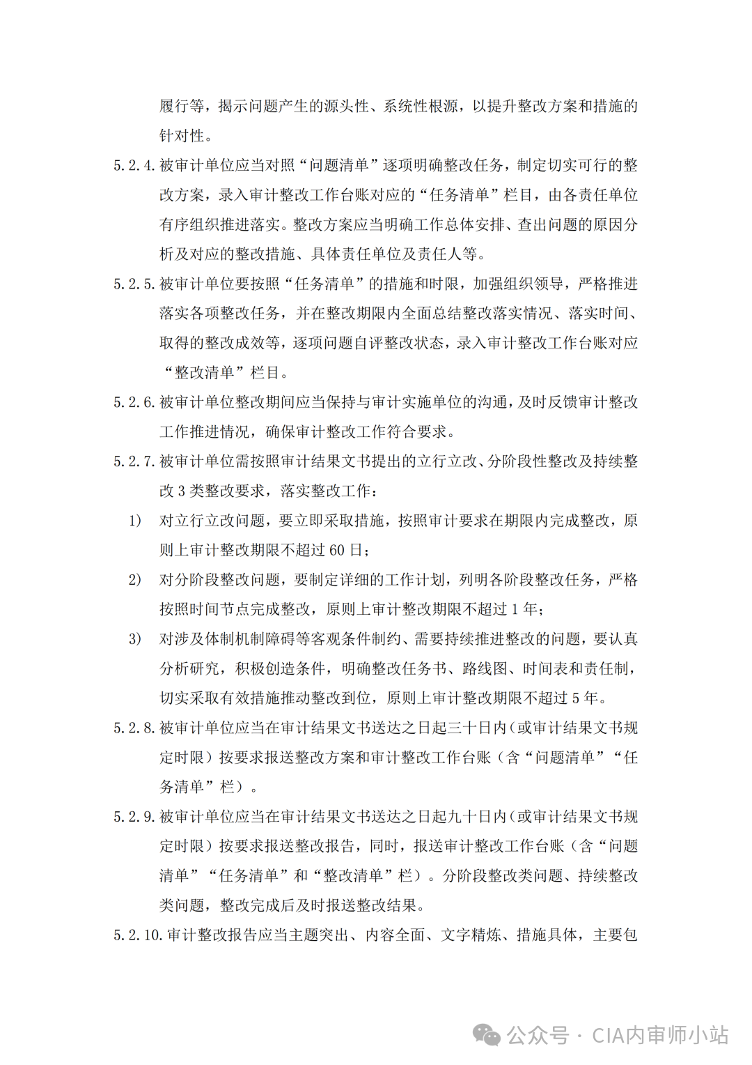5.2.1 审计整改工作一般按照建立问题清单、分析产生原因、制定整改方案、组织整改落实、进展情况检查、整改结果报告等程序开展。5.2.2 被审计单位应当建立 “问题清单”“任务清单”“整改清单” 一体化整改工作台账(参考模板详见附件 2),对审计发现的问题及整改情况实施清单式、动态化管理,根据实际整改情况对照整改要求与措施进行逐一对账销号,对暂未达到整改要求的事项持续开展跟踪直至完成整改。5.2.3 被审计单位收到审计结果文书后,应当一一对应反映问题,全面覆盖建立问题清单,录入审计整改工作台账对应 “问题清单” 栏目。被审计单位应当对审计发现问题的产生原因进行深入分析。原因分析应当突出主观因素,包括问题产生的背景和动机、制度设计和制度执行的缺陷、内部管控职责履行等,揭示问题产生的源头性、系统性根源,以提升整改方案和措施的针对性。5.2.4 被审计单位应当对照 “问题清单” 逐项明确整改任务,制定切实可行的整改方案,录入审计整改工作台账对应的 “任务清单” 栏目,由各责任单位有序组织推进落实。整改方案应当明确工作总体安排、查出问题的原因分析及对应的整改措施、具体责任单位及责任人等。5.2.5 被审计单位要按照 “任务清单” 的措施和时限,加强组织领导,严格推进落实各项整改任务,并在整改期限内全面总结整改落实情况、落实时间、取得的整改成效等,逐项问题自评整改状态,录入审计整改工作台账对应 “整改清单” 栏目。5.2.6 被审计单位整改期间应当保持与审计实施单位的沟通,及时反馈审计整改工作推进情况,确保审计整改工作符合要求。5.2.7 被审计单位需按照审计结果文书提出的立行立改、分阶段性整改及持续整改 3 类整改要求,落实整改工作:1)对立行立改问题,要立即采取措施,按照审计要求在期限内完成整改,原则上审计整改期限不超过 60 日;2)对分阶段整改问题,要制定详细的工作计划,列明各阶段整改任务,严格按照时间节点完成整改,原则上审计整改期限不超过 1 年;3)对涉及体制机制障碍等客观条件制约、需要持续推进整改的问题,要认真分析研究,积极创造条件,明确整改任务书、路线图、时间表和责任制,切实采取有效措施推动整改到位,原则上审计整改期限不超过 5 年。5.2.8 被审计单位应当在审计结果文书送达之日起三十日内(或审计结果文书规定时限)按要求报送整改方案和审计整改工作台账(含 “问题清单”“任务清单” 栏)。5.2.9 被审计单位应当在审计结果文书送达之日起九十日内(或审计结果文书规定时限)按要求报送整改报告,同时,报送审计整改工作台账(含 “问题清单”“任务清单” 和 “整改清单” 栏)。分阶段整改类问题、持续整改类问题,整改完成后及时报送整改结果。5.2.10 审计整改报告应当主题突出、内容全面、文字精炼、措施具体,主要包括下列内容:2)针对审计查出问题和审计建议或意见已采取的整改措施;5)正在整改或尚未整改事项的原因分析以及计划完成时间;5.2.11 被审计单位应当按照审计档案管理要求,将审计整改相关的审计报告、整改通知、结果报告以及相关工作记录、制度文本、决议决定等证明材料分类整理、立卷归档,留存待查。