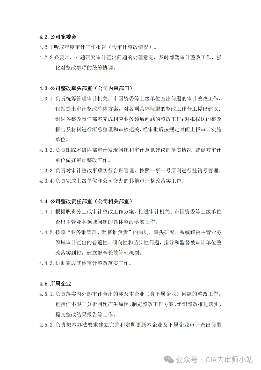 4.5.1 负责落实内外部审计查出的涉及本企业(含下属企业)问题的整改工作,包括但不限于分析问题产生原因、制定整改工作方案、组织整改推进落实、提交整改结果报告等工作。4.5.2 负责按本办法要求建立完善和定期更新本企业及下属企业审计查出问题的整改工作台账,实施清单式、动态化管理。