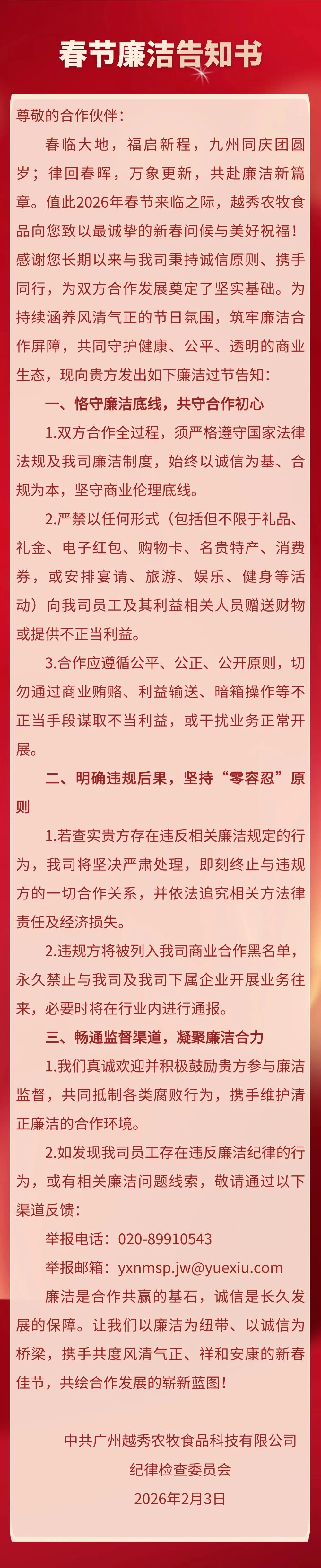 越秀农牧 | 春节廉洁告知书