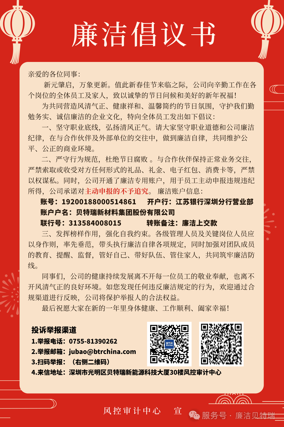 贝特瑞 | 廉洁倡议书