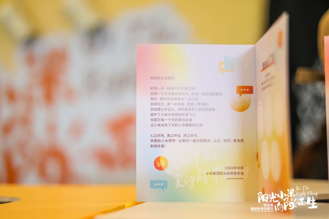 “ 为进一步完善小米集团职业道德体系建设工作,继续打造风清气正的职场环境,2024年10月至11月,集团职业道德委员会分别在北京、武汉、上海、南京、深圳职场举办了“阳光小米,向阳而生”廉洁合规主题活动。”