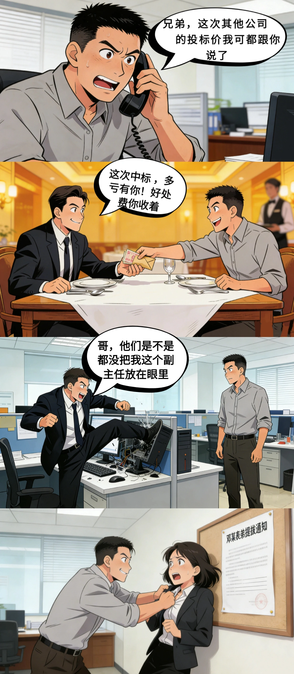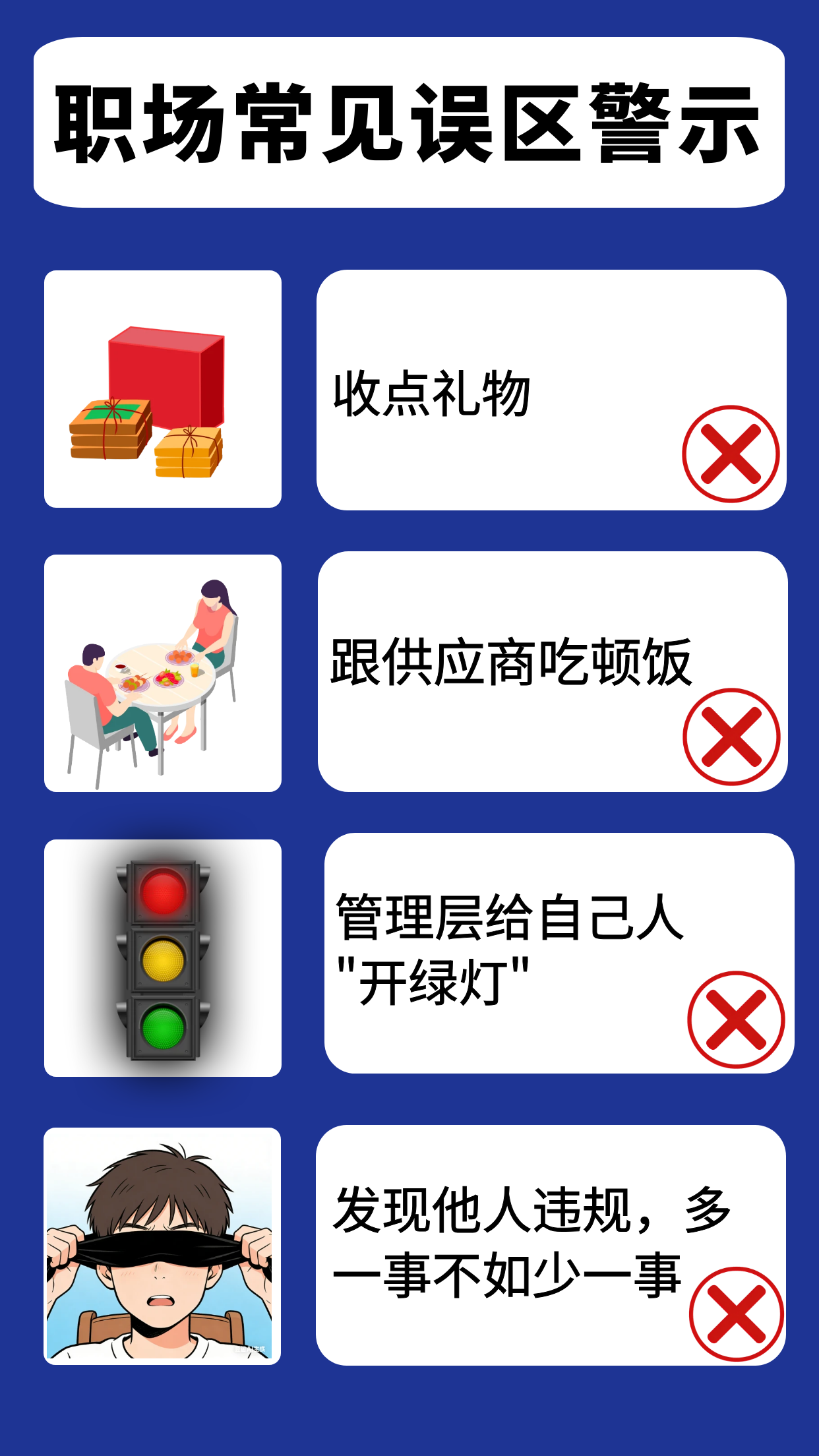 以案为鉴 近期,审计监察部经调查核实,某工厂厂长邓某任职期间存在多项严重违规违纪行为:接受供应商宴请、多次接受供应商好处费、私自透漏其他供应商投标价格、骚扰女员工等,同时对其表弟(车间副主任)损害公司财物、欺压下属等问题未履行监督管理责任,造成恶劣影响。 综上,根据公司相关制度规定,给予邓某及其表弟开除处理、考核全部绩效、追缴违法所得;对其任职期间管理链条上履职不到位的相关领导干部,追究相应管理责任;同时将邓某移送司法机关,依法追究法律责任。 帮大家盘点几个常见的职场合规误区,快自查避坑吧! 启示 无论身处管理岗位还是一线岗位,只要触碰制度红线、违反职业道德、损害公司利益,都必将受到严肃处理。公司一视同仁、绝不姑息。 合盛审计监察部提醒您,如发现身边存在违规违纪线索,可通过以下几种方式举报: 1、二维码直接举报 2、电话|18368380929 3、微信|hstousu 4、邮箱 | hstousu@hoshinesilicon.com 合盛鼓励员工实名举报,对举报人的信息严格保密,根据举报线索的有效性,举报人最高可获得追回损失的50%的奖励