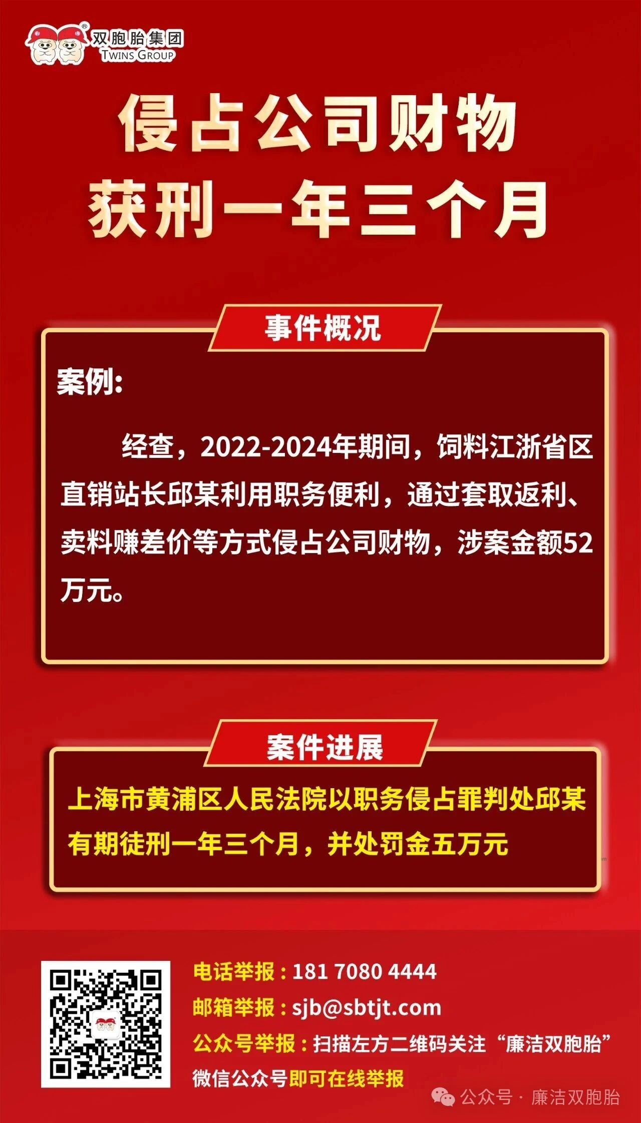 双胞胎集团以案为鉴丨侵占公司财物 获刑一年三个月