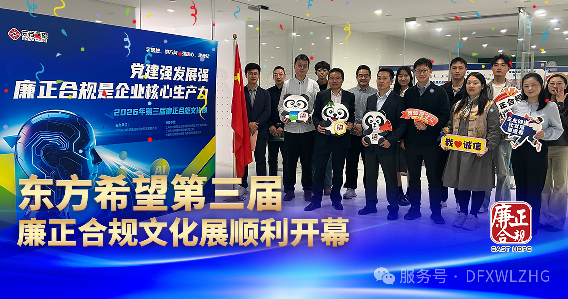 4 月 8 日上午,东方希望第三届廉正合规文化展开幕式在东方希望大厦B2展厅成功举办。本次活动以“党建引领守初心,廉正合规促发展”为主题,将党建工作与廉正合规建设深度融合,进一步筑牢企业健康发展根基。