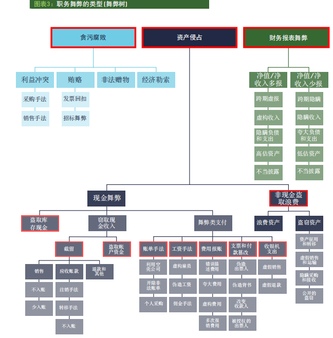 这张图清晰展示了三类舞弊的逻辑结构、典型表现与行为方式。