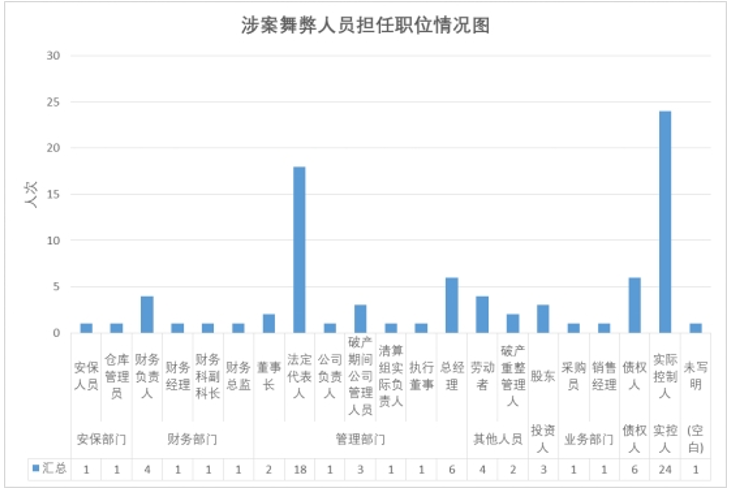 该类案件中涉案人员职位分布较广,包括管理部门、财务部门、业务部门、安保部门、投资人、实控人、债权人等其他人员。其中,管理部门(共计32个案件)和实控人(共计24个案件)实施投资与破产舞弊行为的案件明显较多,占总涉案人员职位约67.5%。据此,结合该些职位的工作职权,可以初步判断由于该些涉案人员掌握着公司的控制及管理的权限,对企业财产进行隐匿、转移和处分等一系列舞弊行为而不受限制的可能性较高。