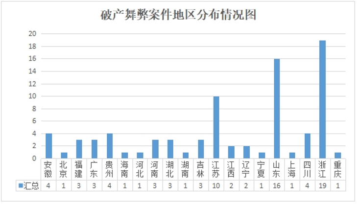 根据公开裁判文书显示,投资与破产舞弊案件分布地区较广,共涉及20个省、自治区、直辖市。其中,明显高发的地区,依次为浙江省(19个)、山东省(16个)、江苏省(10个)。