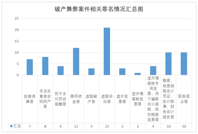 根据公开裁判文书显示,该类案件共涉及11个罪名,其中虚假诉讼罪数量最多,达21个;职务类犯罪也较多,职务侵占罪为10个,挪用资金罪为12个,共计22个。其余则涉及虚开发票罪等刑事罪名。