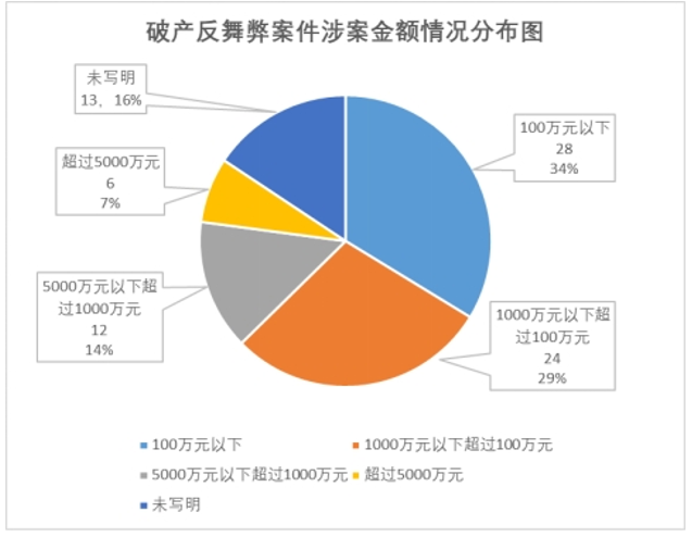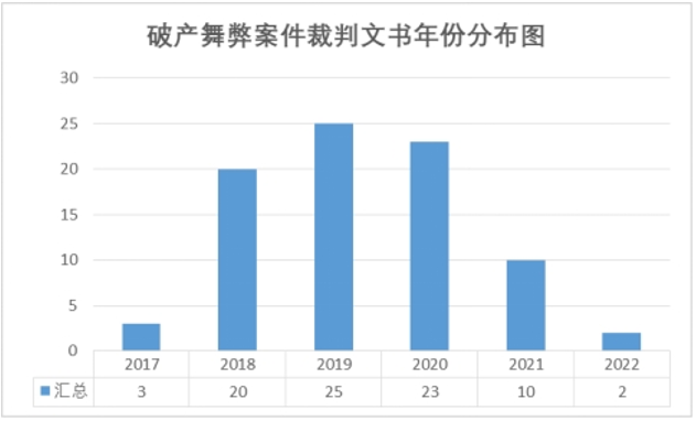 通过对近十年涉及投资与破产舞弊案件的裁判文书的检索,共获得83份有效的裁判文书,以下将针对该些案件的涉案地区、涉案人员的职位、裁判文书中的年份、罪名、案值、刑期进行分析,并结合新闻报道、实务经验,总结恶意减损公司财产、恶意提前分配公司财产、恶意虚增公司债务,以及滥用优先债权四类主要的舞弊行为类型。