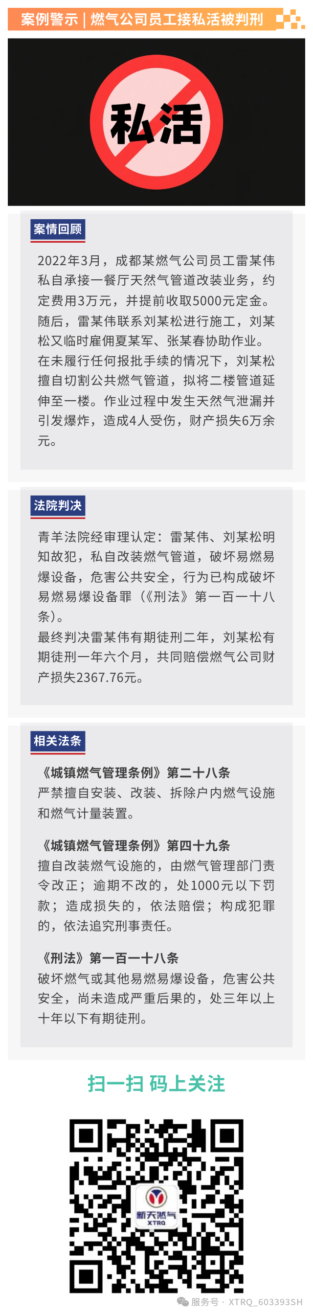 鑫泰案例警示 | 燃气公司员工接私活被判刑