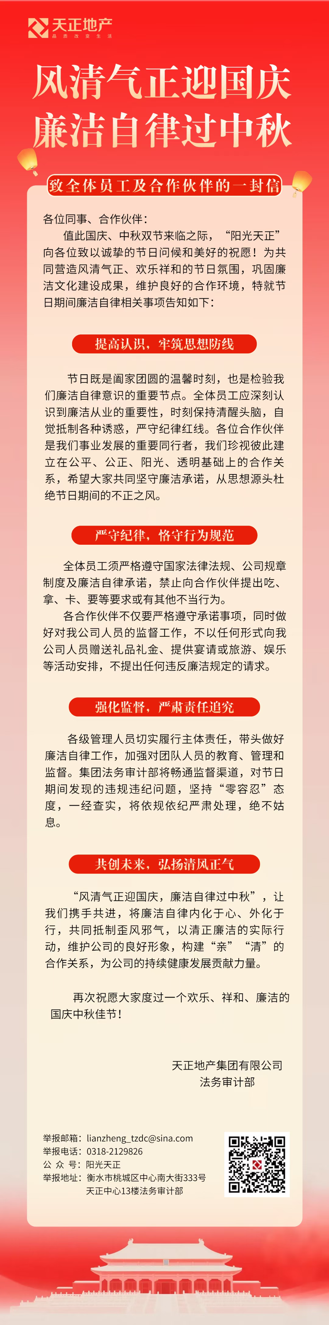 天正地产|风清气正迎国庆,廉洁自律过中秋
