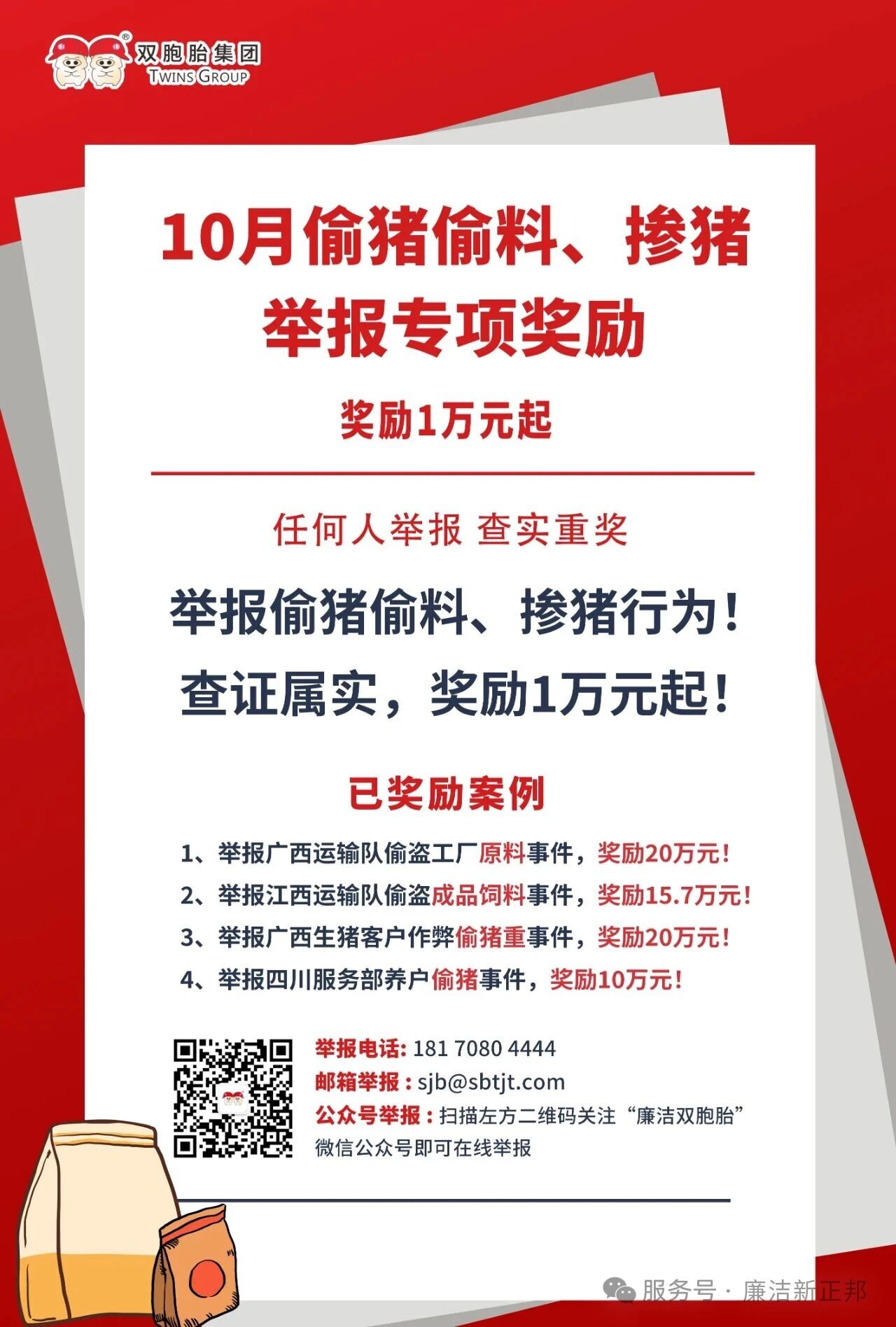 双胞胎集团|偷猪偷料、掺猪举报专项奖励,奖励1万元起