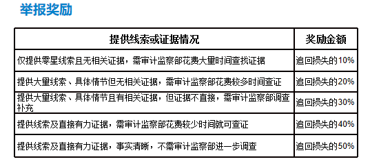 公司设立举报现金奖励,按追回损失比例分级发放。