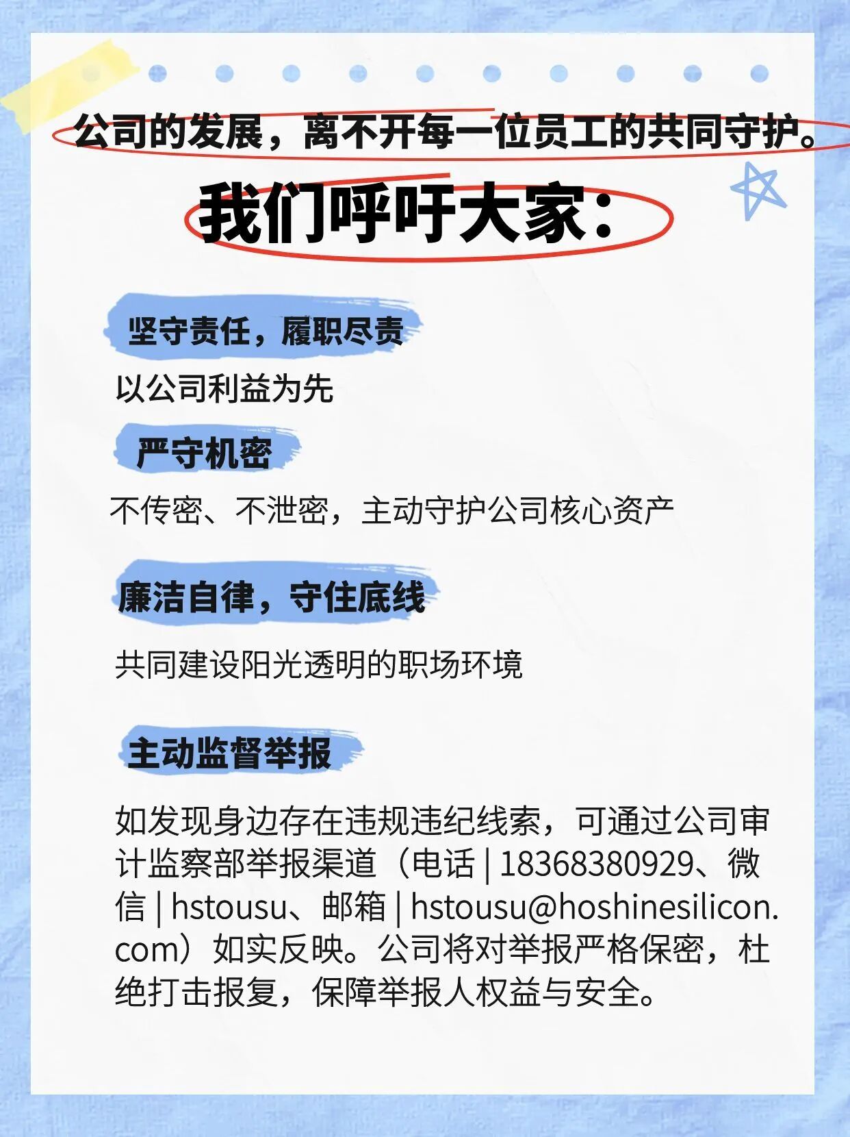 合盛审计监察部提醒您,如您的身边发生任何腐败或者舞弊事项,可通过以下几种方式举报举报方式: 1、扫描二维码直接举报 2、电话|18368380929 3、微信|hstousu 4、邮箱|hstousu@hoshinesilicon.com 合盛鼓励员工实名举报,对举报人的信息严格保密,根据举报线索的有效性,举报人最高可获得追回损失的50%的奖励