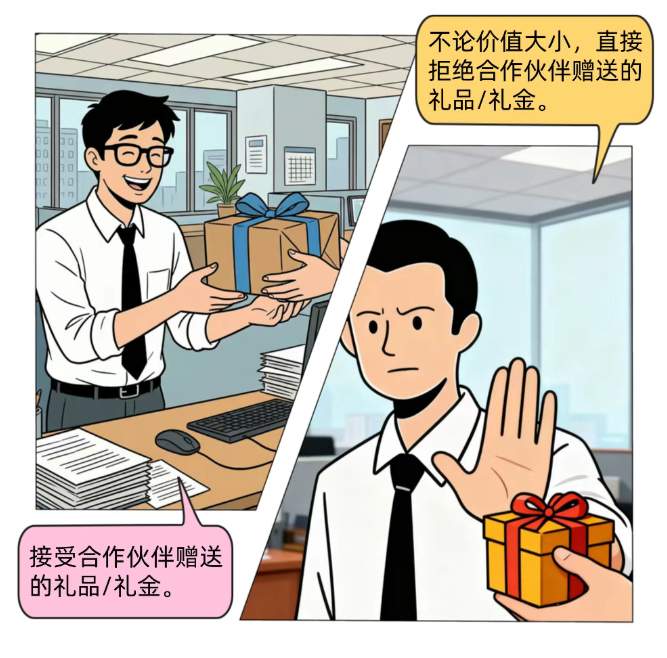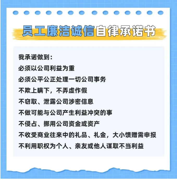 人情往来守分寸 秉持公正立场,不借职务之便为亲友谋求特殊待遇,坦然拒绝业务往来中的宴请与礼品礼金,让人情往来回归纯粹本质; 流程执行守原则 在审批、采购、数据管理等环节,严守制度规范、不搞 “弹性操作”、不越规则红线,不擅自简化流程、变通规则,不通过违规操作换取个人或他人利益,维护流程的公正性与企业利益; 信息安全守底线 严格遵守公司信息安全管理规定,妥善保管公司机密、客户资源等敏感信息;不得擅自泄露、篡改、滥用相关信息,不以信息交换谋取个人利益,保障企业信息安全与商业利益。