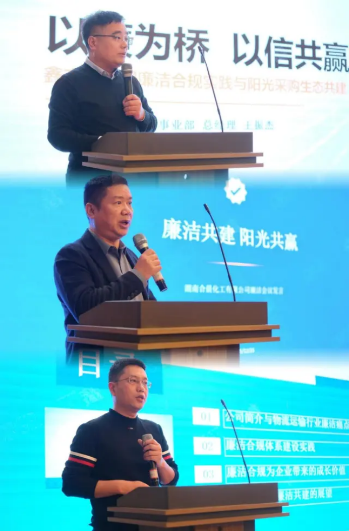 为凝聚共建共识,大会特邀三家分别来自设备、化工、物流板块的供应商代表分享廉洁合作实践。他们结合自身在廉洁内控体系建设、诚信文化培育等方面的具体做法与成效,生动阐述了“廉洁就是竞争力”“诚信方能行稳致远”的深刻道理。来自合作伙伴的“现身说法”,为共建阳光生态提供了可借鉴、可感知的实践路径,引发了与会者的广泛共鸣。