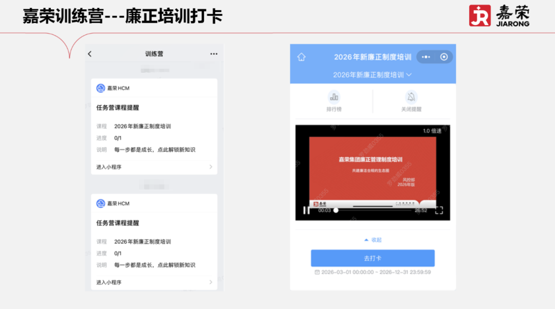 1、制度焕新|全维度规范 扎紧廉洁“制度笼子” 集团正式发布 2026 年公告版《廉正及违纪行为管理制度》,在原有基础上完成全面优化升级: ①覆盖范围更广:延伸至全体员工所有违纪行为; ②行为界定更清:细化四大类舞弊行为; ③奖惩规则更明:明确轻重处罚情形及举报奖励机制; ④执行要求更严:培训考核与晋升调薪直接挂钩; ⑤流程保障更全:明确调查权限、赋予员工申诉权利。 2、线下精培|总部经理级先行 筑牢管理示范防线 本次培训率先聚焦总部各部门经理开展线下专题培训。课程紧扣新版制度核心,结合管理岗位高频风险环节,精准讲解制度条款、红线界定与防控方法;切实强化自身/团队中的责任担当,以管理层率先垂范推动廉洁理念层层传导。 3、云端普学|全员线上打卡 实现廉洁教育无死角 除总部经理级外的全集团人员,采用嘉荣训练营线上打卡形式开展培训,覆盖集团本部/子公司全体员工,培训周期贯穿全年。在指定时间完成线上课程学习,独立完成、严禁代学代打卡,确保学习时长达标、打卡信息准确,让廉洁知识精准触达每一个岗位。 4、以考促学|全员严格考核 结果挂钩职业发展 所有完成线下/线上培训人员,均需参加线上廉正知识统一考核,试题紧扣制度核心与岗位实操,考核规则详见公司OA公告。同时,培训参训情况、考核结果将纳入员工个人成长积分及绩效考核,以考核压实学习成效,让廉洁合规理念深植于心、笃见于行。 5、重要提示 全体员工需在2026年3月31日前通过企微完成《诚信承诺书》线上签署存档,及线上培训打卡/考核,各单位/部门做好核查督促,确保全员覆盖;新版制度全文及配套附件已上传OA,敬请查阅学习。 廉筑根基,合规致远。嘉荣集团将以此次制度发布与全员培训为契机,持续深耕廉洁合规文化建设,让诚信成为每一位嘉人的职业底色,以风清气正的职场环境,护航企业发展!